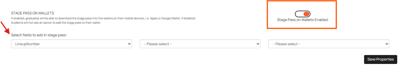 At the bottom of the stage pass properties tab is a setting for "Stage Pass on Wallets".  When toggled on (to the right), you can add up to 3 additional fields in your wallet.  These fields come directly from your graduate data.