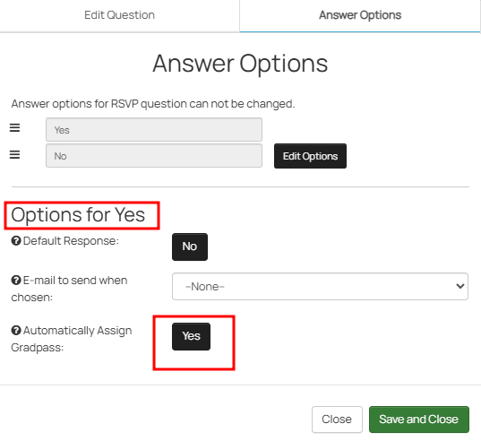 - In the registration form RSVP question, under Answer option, make sure "Automatilcally Assign Stage pass" is set to "yes"