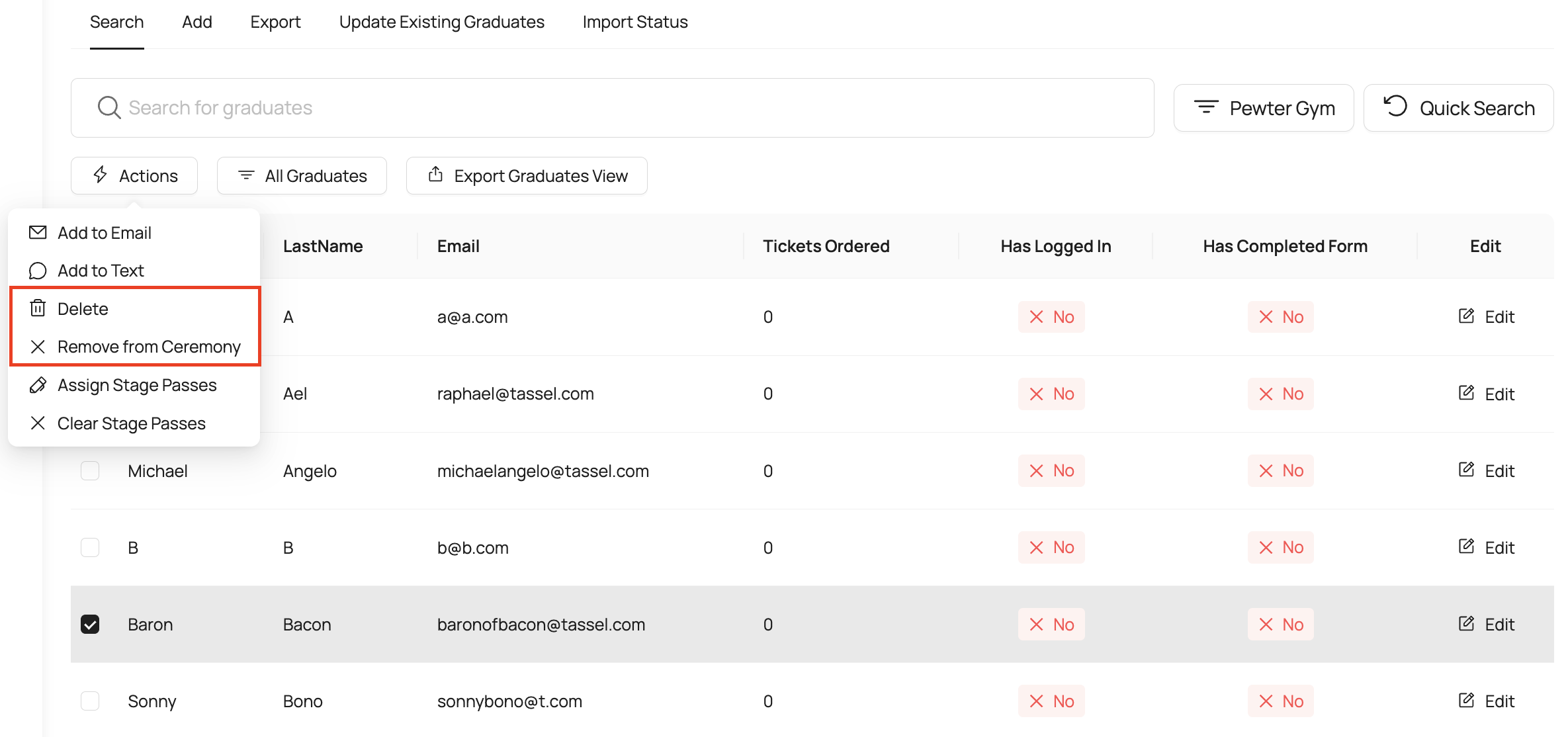 - Select the specific ceremony you wish to remove graduates from in the All Ceremonies drop down menu at the top.