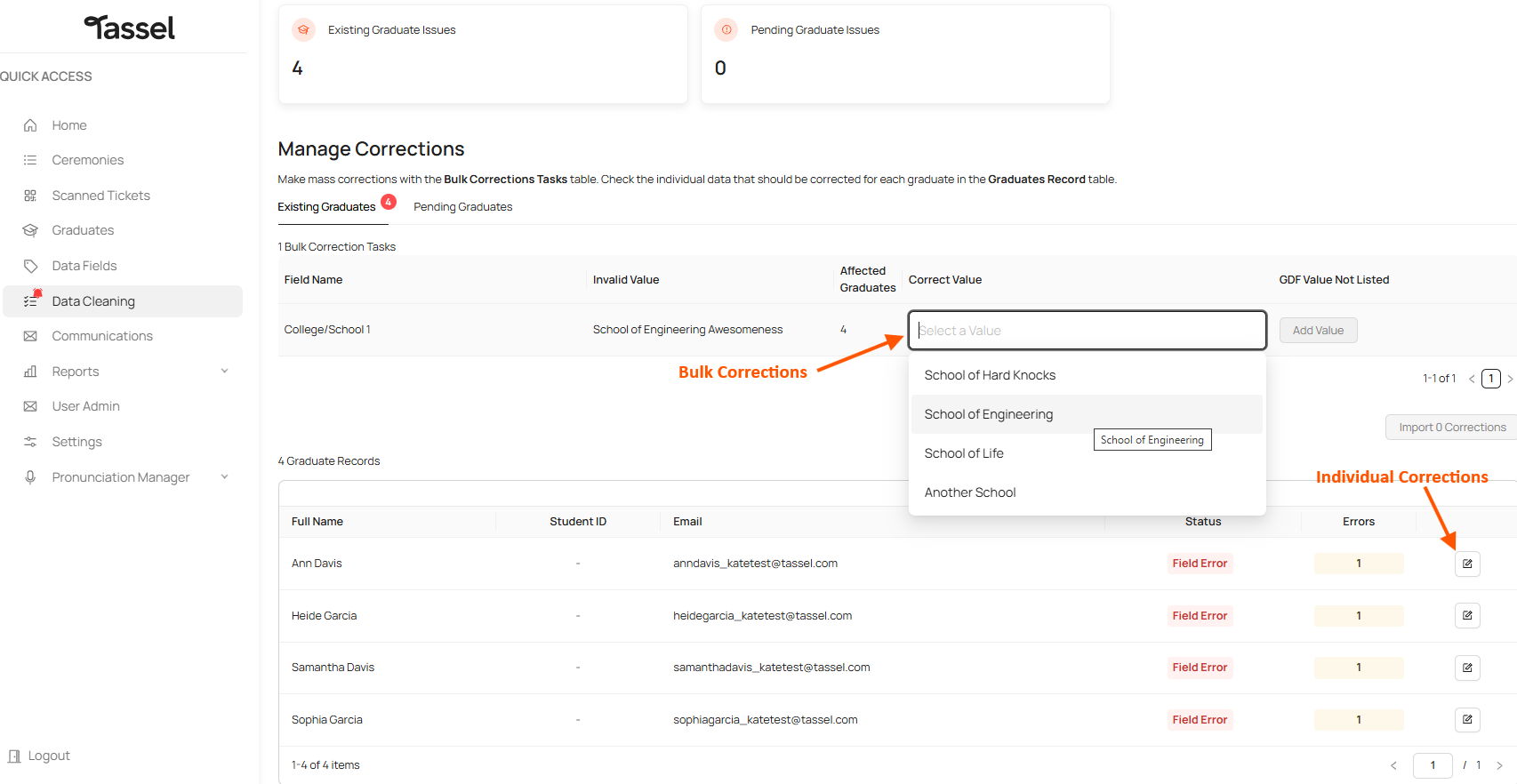 Like correcting graduate data upon import, you can bulk correct graduate data by selecting the new correct value for all affected grads, or update graduates